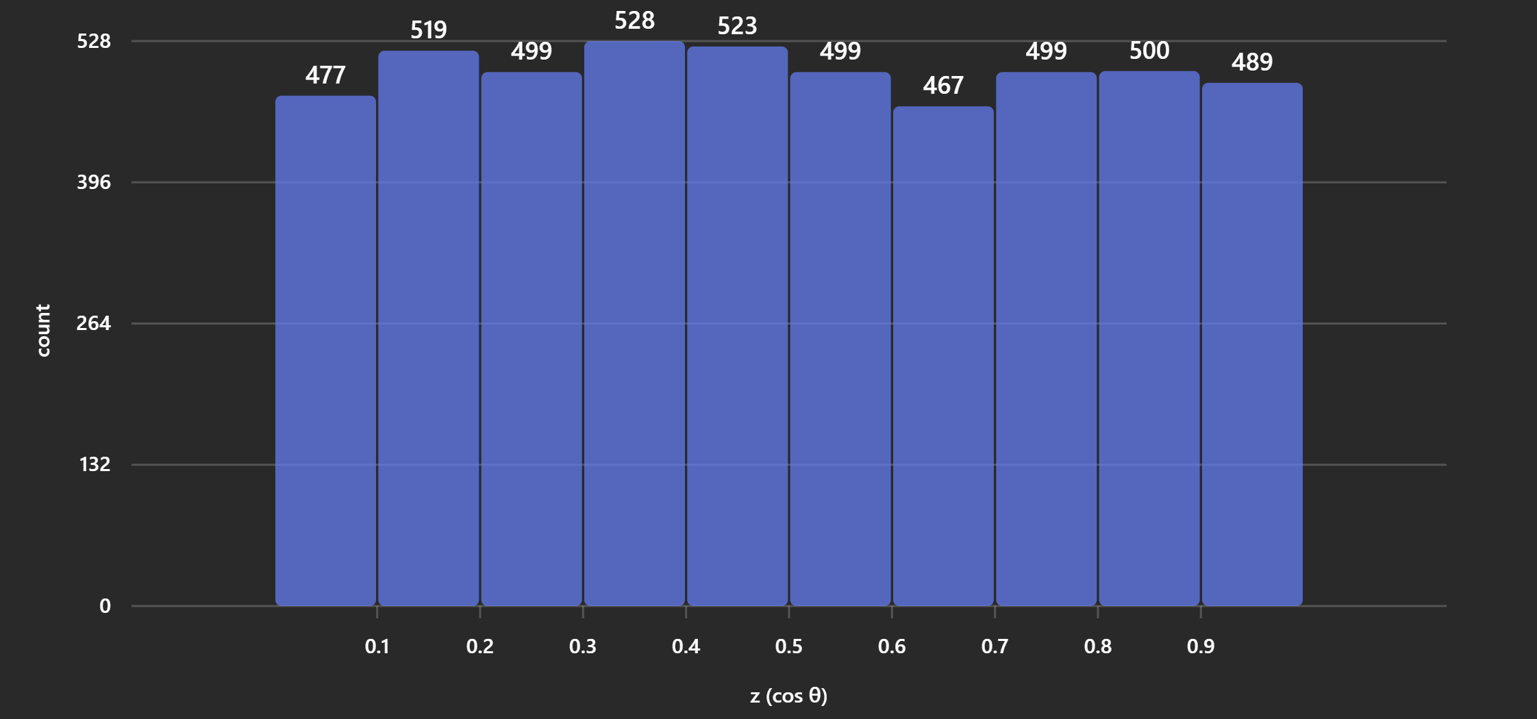 The histograms below show how often samples land in each elevation band — confirming that cosine-weighted sampling concentrates samples near the normal (\(z \approx 1\)):